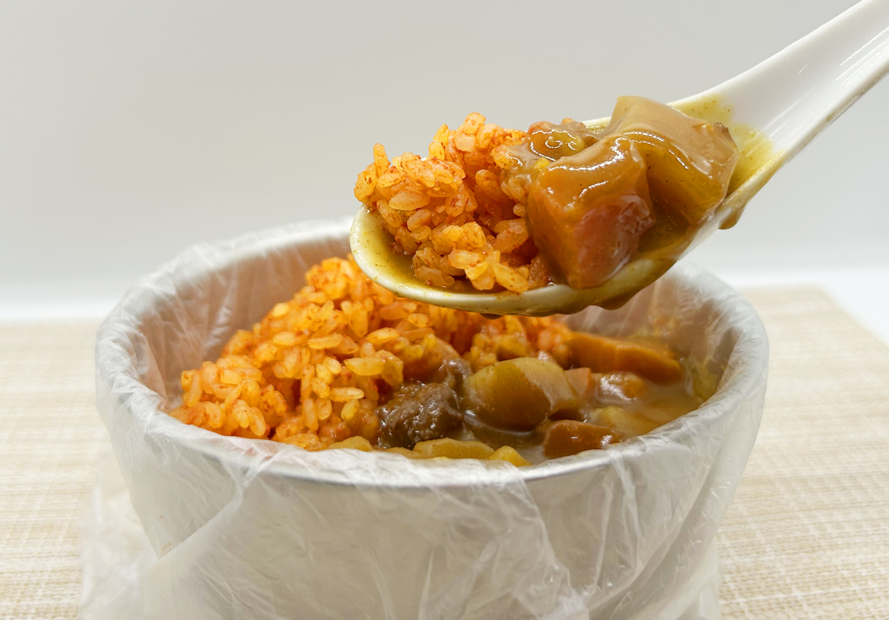 ⚫︎美味しさを閉じ込める真空パック×計量カップとして使える外袋。被災時を想定したパッケージを採用。