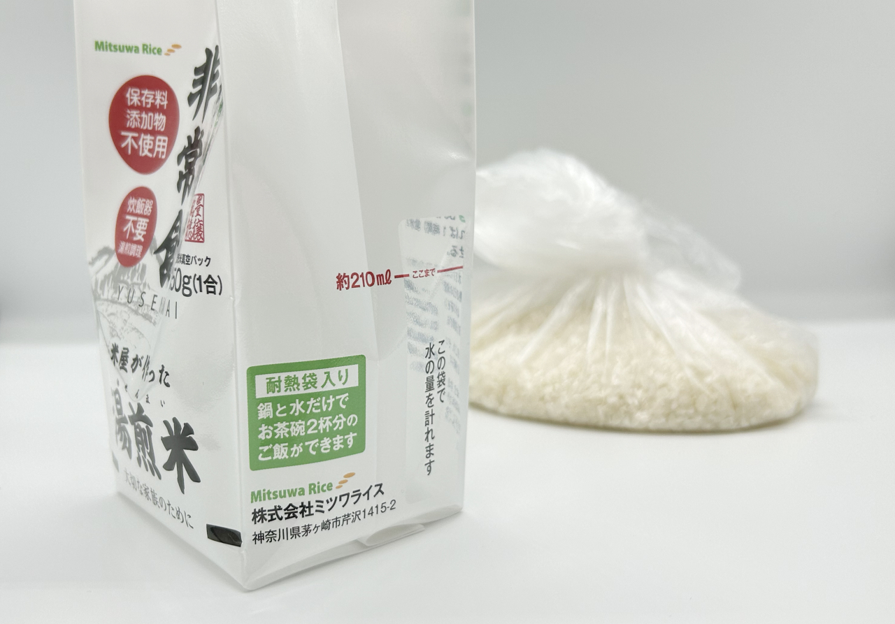 開発において最もこだわったのは、外袋に刻んだ目盛りです。当初は真空パックだけの仕様でしたが、計量カップなどがない被災時の状況での調理を想定するのなら、目盛りは絶対に必要だと考えました。