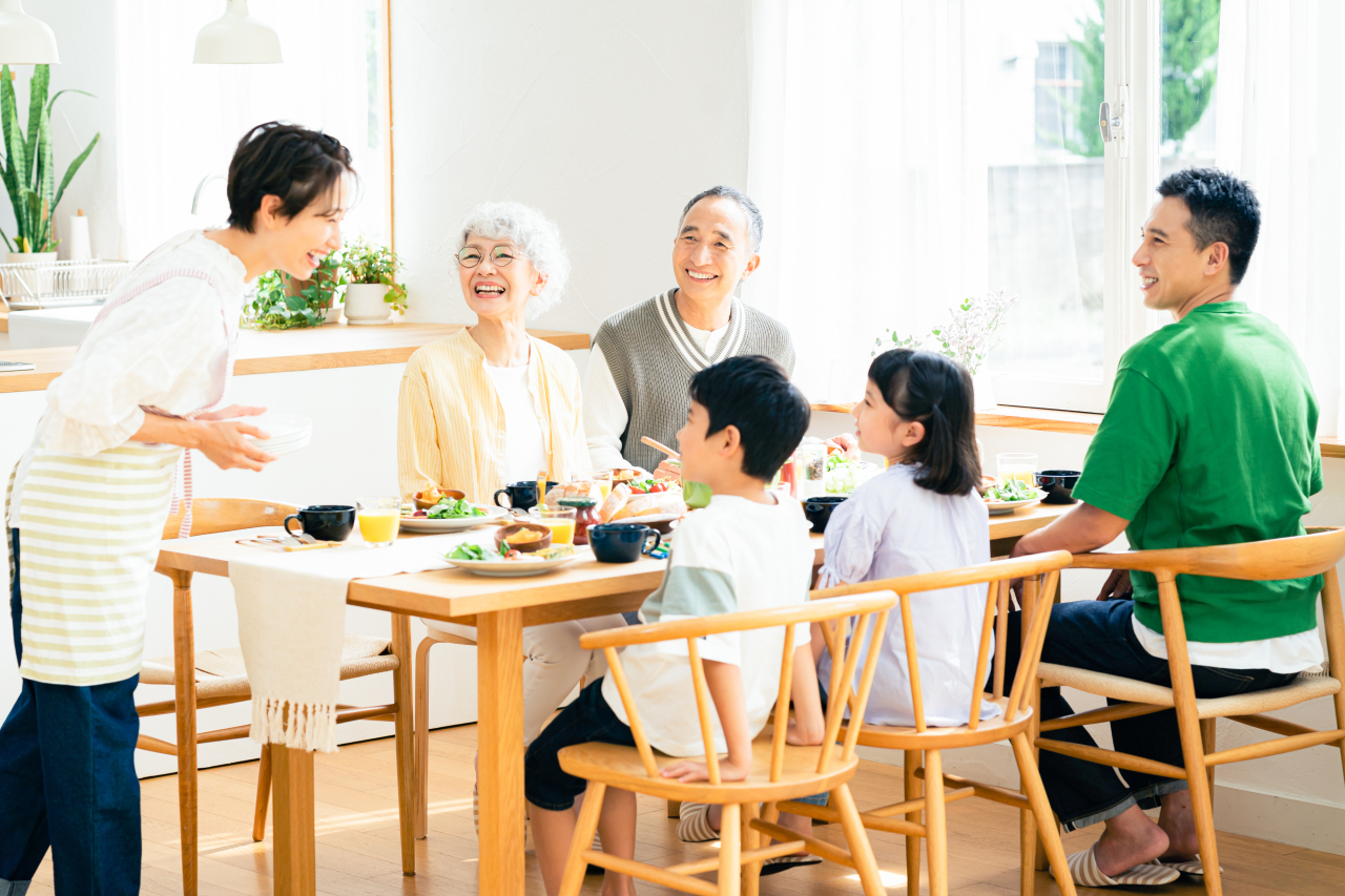 家族の笑顔と「美味しいね」「おかわり!」という会話。