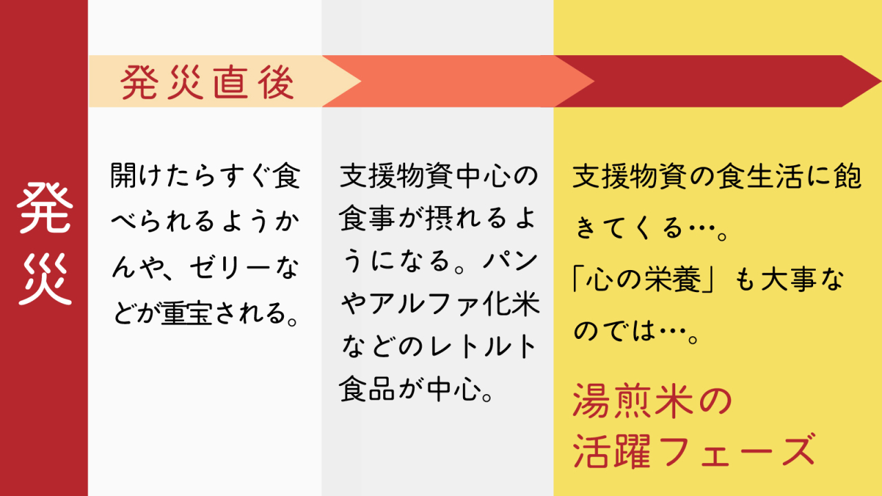 このような状況の中、湯煎米は時間を有効に活用しながら皆さまで調理できるため、非常に適していると考えられます。「時間は確保できる」という段階にある被災者の方々にとって、湯煎するという過程そのものが有意義な活動となり、自然と役割分担が生まれることでコミュニティの形成にもつながるとのことです。